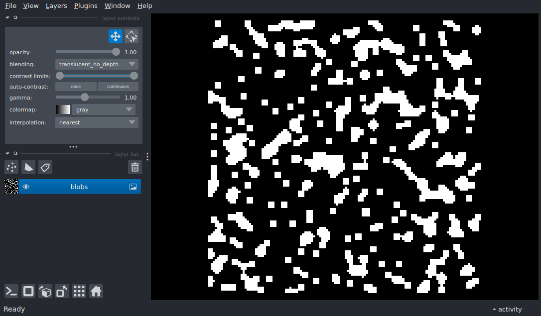 length=128, blob_size_fraction=0.05, n_dim=2, volume_fraction=0.25