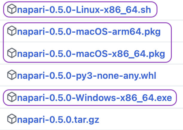 If you are interested in an earlier version of napari, you may access those files by scrolling below the latest release on the napari release page. The instructions below will work for napari versions 0.4.15 and above.
