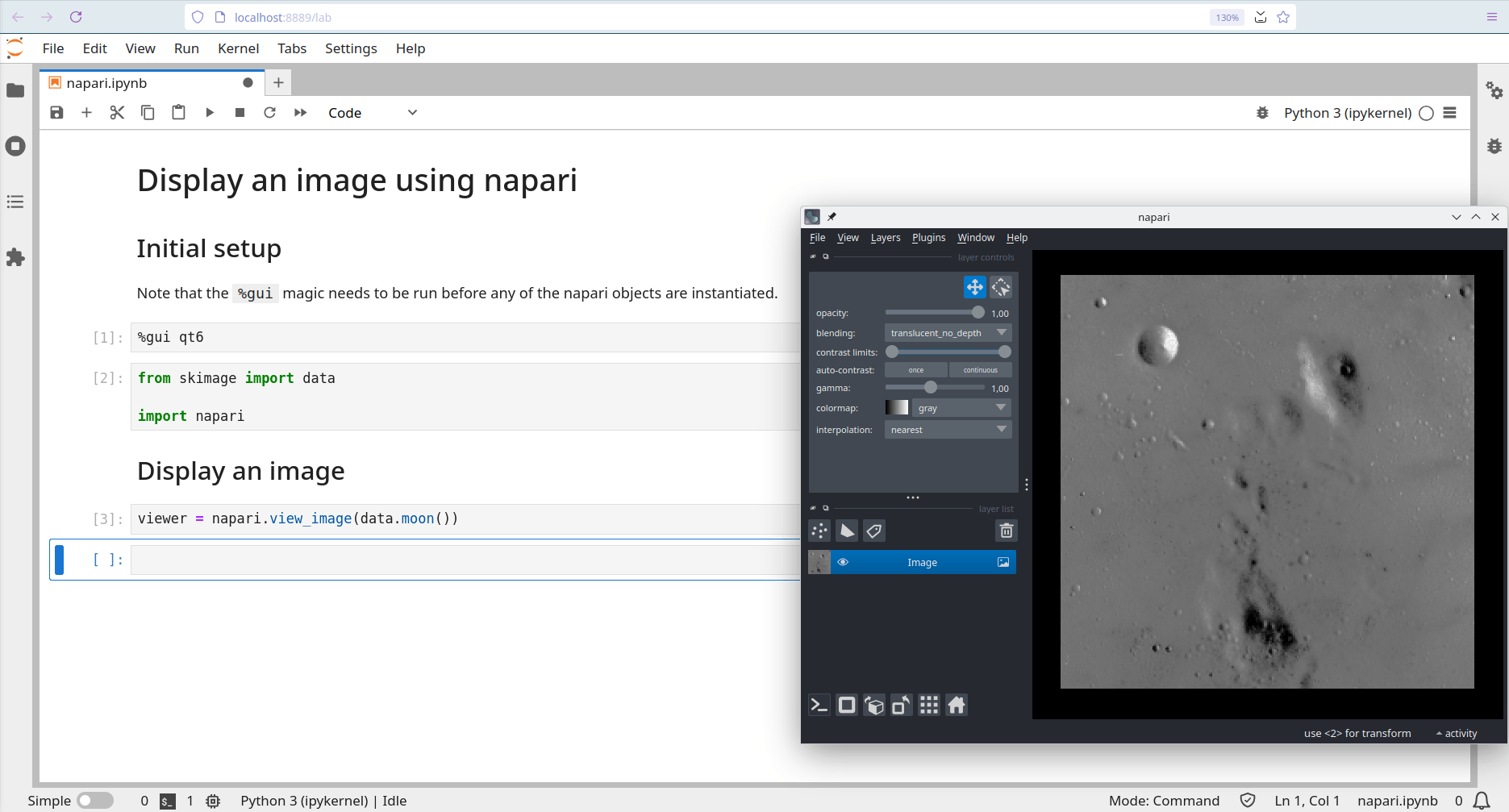 An advantage of launching napari from an IPython console is that the you can continue to programmatically interact with the viewer from the IPython console, including bidirectional communication, where code run in the console will update the current viewer and where data changed in the GUI will be accessible in the console.